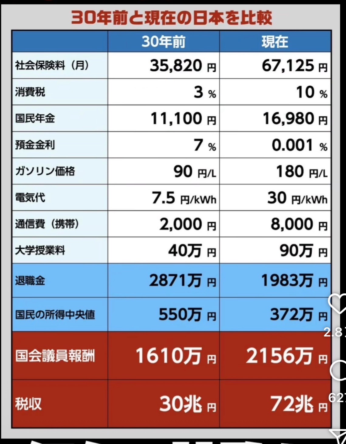 物価が上がって国民負担は増える一方なのに、30年前よりも所得が減っている・・・