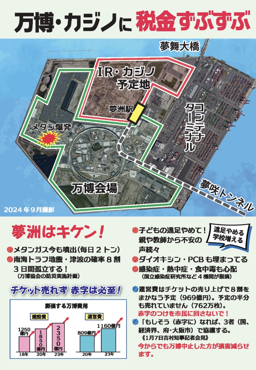 維新は夢洲の地面改良や交通整備(大阪メトロ延伸など)に、万博で約3187億円、カジノで約788億円の税金を使った。カジノ反対の市民団体やメディアは「維新が外国企業を助けるために万博を口実にした」と批判する。